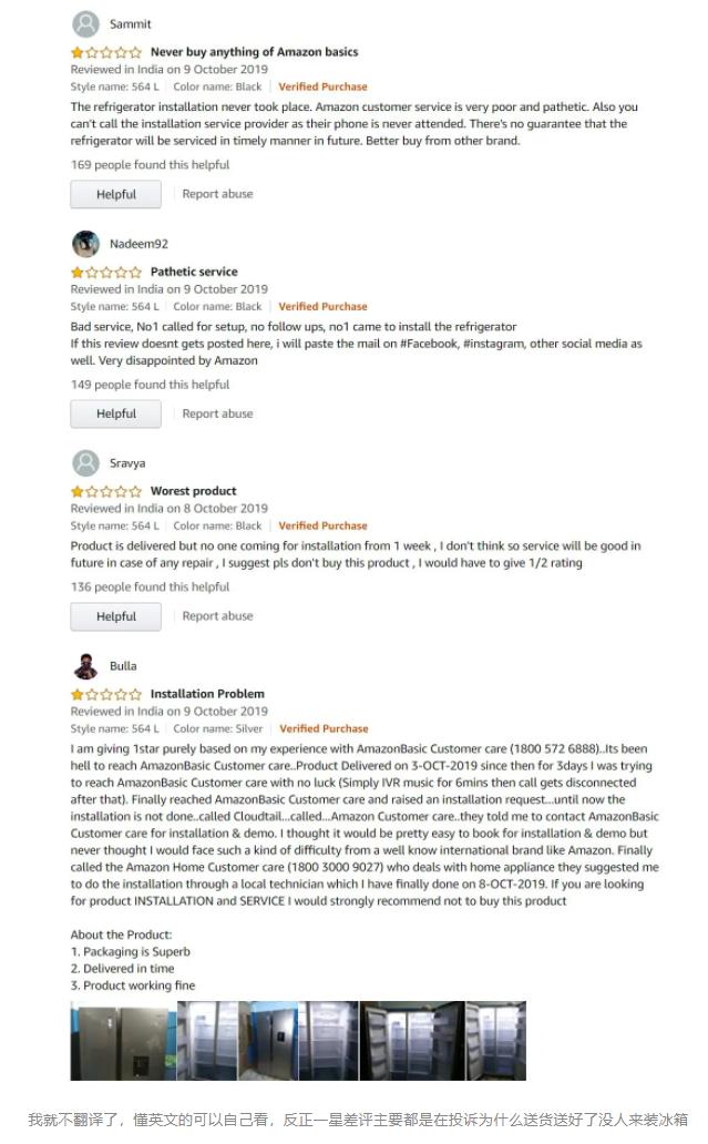 我就不翻译了,懂英文的可以自己看,反正一星差评主要都是在投诉为什么送货送好了没人来装冰箱