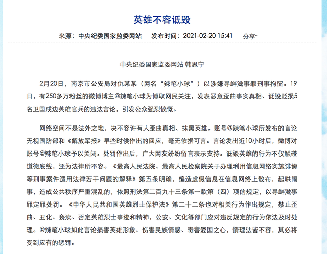 2月20日,南京市公安局对仇某某(网名“辣笔小球”)以涉嫌寻衅滋事罪刑事拘留。19日,有250多万粉丝的微博博主@辣笔小球为博取网民关注,发表恶意歪曲事实真相、诋毁贬损5名卫国戍边英雄官兵的违法言论,引发公众强烈愤慨。