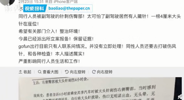 2月23日,广东广州,一网友爆料称,租了一辆共享汽车,在副驾驶座位上发现4个针头。该网友称,当时同行的人没注意,直接坐下去后便被扎到臀部,约2厘米深,当时害怕有病毒,自己拔了出来。随后,该网友报警,并前往医院检查治疗。对此,共享汽车回应座位现针头扎伤乘客,目前正在配合警方处理。