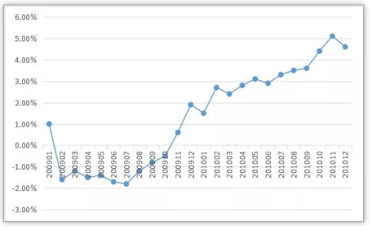 2009年,因为全球性金融危机,中国启动了4万亿救市计划,当年中国GDP大致是34.8万亿,我们通过财政4万亿+信贷一共投放了接近10万亿的新增货币,新增货币GDP占比大致是25%—30%,然后从2009年8月开始,通胀指数就一路攀升。