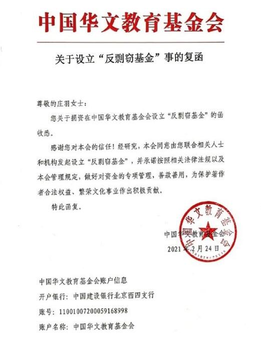 根据庄羽公布的有关中国华文教育基金会的文件,该基金会已经同意由庄羽联合相关人士和机构发起设立“反剽窃基金”,将会对资金进行专项管理,保护著作者的合法权益。
