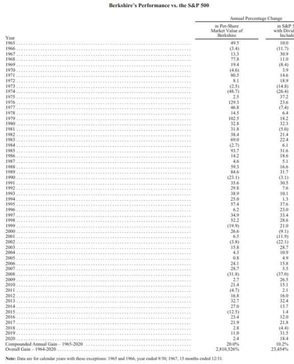 依照惯例,第一页是伯克希尔哈撒韦业绩与标普500指数表现的对比,2020年,伯克希尔哈撒韦股价年度涨幅2.4%,而同期内,标普500指数计入股息再投资的整体回报率为18.4%。长期而言,1965年至2020年间,伯克希尔哈撒韦股价复合年均增长率为20%,大幅超过标普500指数10.2%的复合年均回报率;1964年至2019年间,伯克希尔哈撒韦股价累积增长率更达到惊人的2,810,526%,远高于标普500指数23,454%的累积回报率。