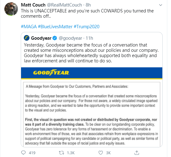 因此,那些对固特异不满的美国右翼群体就认为固特异不过是在“狡辩”,甚至认为固特异是“变相承认”了他们就是在反特朗普和反右翼白人。而固特异方面关闭了这则声明的评论功能,也进一步加强印证了他们的这种观点。