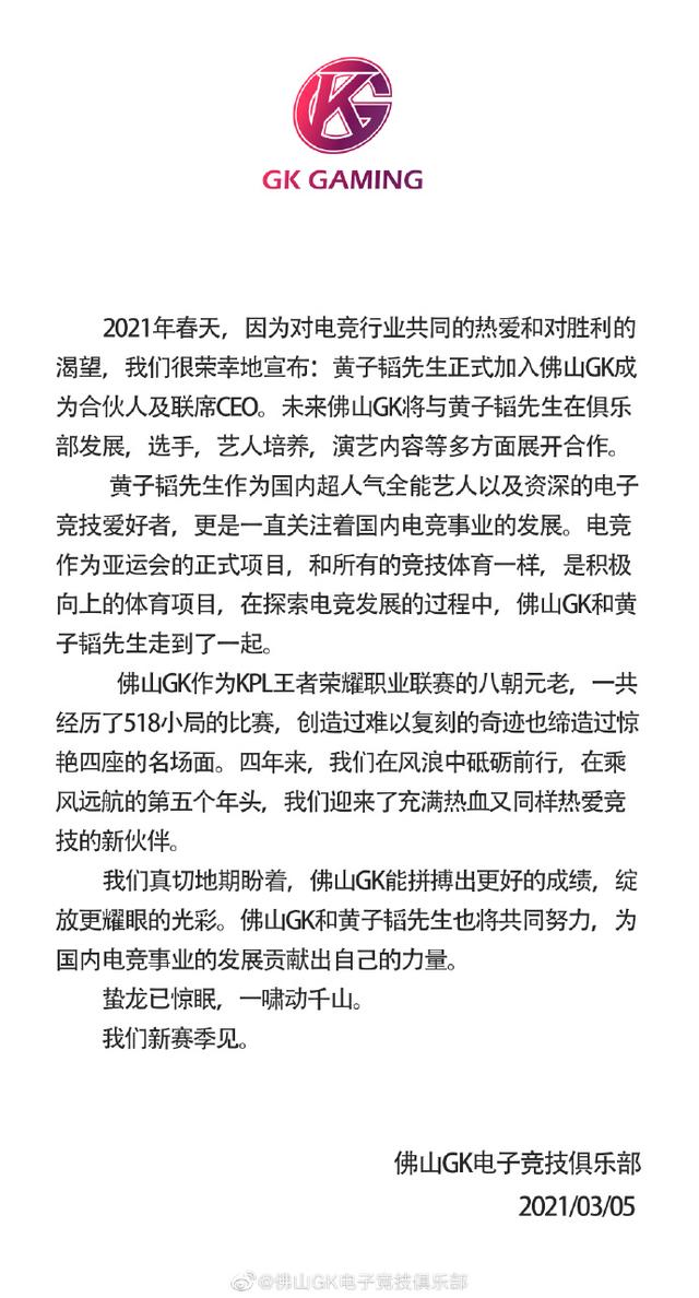 佛山GK电子竞技俱乐部在其官方微博宣布:黄子韬先生正式加入佛山GK成为合伙人及联席CEO。未来佛山GK将与黄子韬先生在俱乐部发展、选手、艺人培养、演艺内容等多方面展开合作。