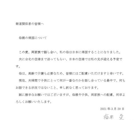 当天爱妈返回日本的消息传开后,福原爱火速发出声明,解释了爱妈返回日本是双方商议的结果,并表示,爱妈回到日本后,将会由哥哥前往机场接机。