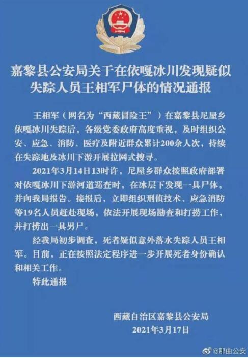 长沙晚报掌上长沙3月23日讯据中国网文化消息3月22日,有媒体从“西藏冒险王”王相军的弟弟王龙、其聘用代理律师尤宏旭以及其他相关渠道证实,嘉黎县警方经过DNA鉴定检测,确认近日从依噶冰川下游冰层打捞出来的男尸为此前落水失踪的王相军本人。王龙透露,其聘请的以尤宏旭律师为首的团队已在赶赴嘉黎县途中,几个小时之后到达嘉黎县与专家证人会合。嘉黎县警方和家属及律师团队沟通畅通,将共同查清真相。王龙亦表示,他们此次聘请了著名法医专家,将参与见证警方组织的尸检过程。