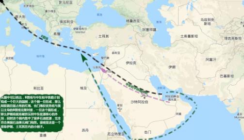上图中黑色为B管线,浅粉色为中东和平铁路,墨绿色为从波斯湾穿越埃及到达欧洲南部的海权线。