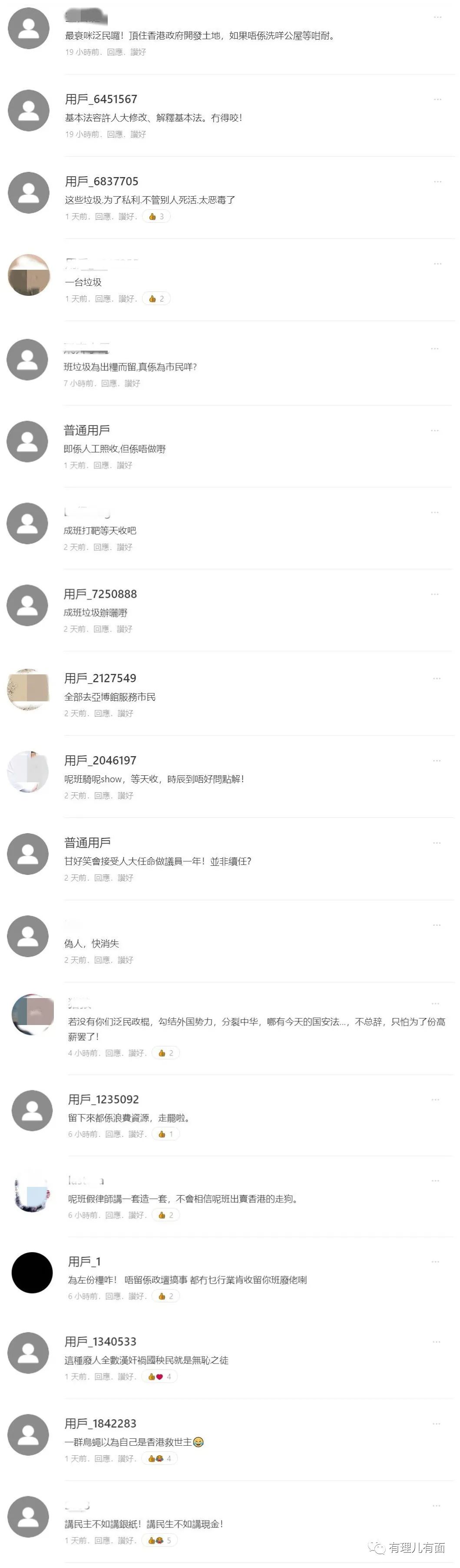 无耻就是可以做的这么冠冕堂皇。当然,这番表演的丑剧可逃不过香港网民的眼,看看他们一针见血的评论就知道了“这些垃圾为了私利,不管别人死活,太恶毒了”、“一班垃圾,真的是为市民吗?”、“等天收,时辰到唔好问点解(时间到了不要问为什么)”、“讲民主不如讲银纸!讲民生不如讲现金!”……