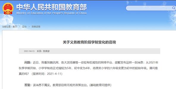 这位网民在4月11日提问称,“近日,我看到腾讯网、各大浏览器等一些较有权威性的网络平台,频繁发布这样一则消息:从2021年秋季学期开始,小学学制将正式缩短为5年,初中变为4年,将原来小学的六年级变更为初中的起始年级。请问是真的吗?”