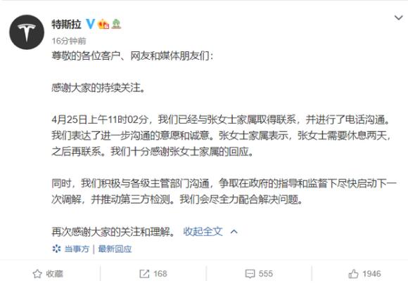 特斯拉发文回应:已与车主联系,争取第三方检测