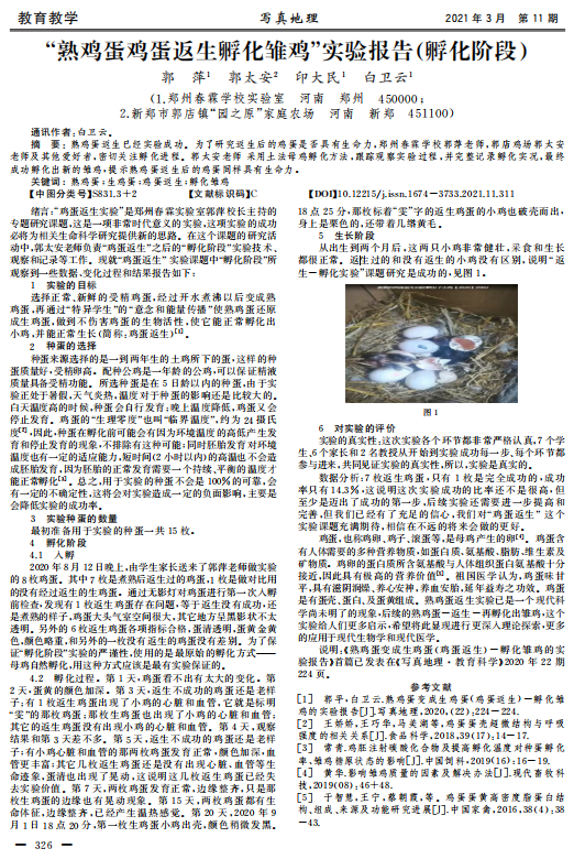 澎湃新闻注意到,前述实验目标,被称作“鸡蛋返生”,出自《“熟鸡蛋鸡蛋返生孵化雏鸡”实验报告(孵化阶段)》一文,由郑州春霖学校实验室和新郑市郭店“园之原”家庭农场发表在刊物《写真地理》2021年3月第11期。作者为郭萍、郭太安、印大民、白卫云,其中,“校长”郭萍是“鸡蛋返生实验”专题研究课题的主持者。
