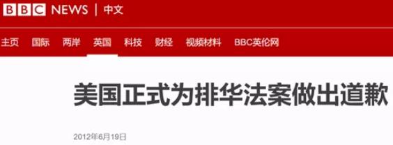 根据BBC的报道,美国众议院2012年6月18日全票表决通过,以立法形式向曾经排斥和歧视华人的做法道歉,这一道歉案2011年10月获得美国参议院的通过,但非常明确表明,立法道歉并不会向受到这一排华法案影响的美籍华裔家庭索赔提供依据。