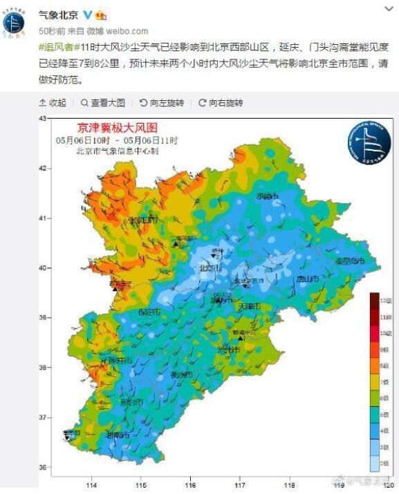 气象北京:11时大风沙尘天气已经影响到北京西部山区