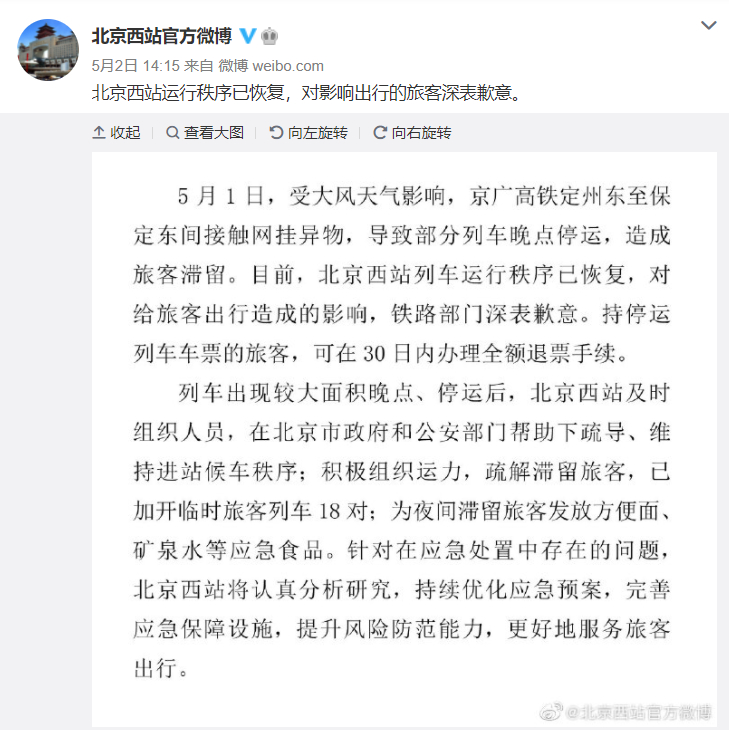 央视网消息:“五一”小长假第一天,“北京西站”就上了热搜。因为大风天气,京广高铁接触网挂异物导致高铁断电,多趟高铁无法发车,大量乘客滞留在北京西站广场和检票口。经铁路部门紧急抢修,供电系统及时恢复,截至5月1日晚上11时以后,北京西站站内已经没有滞留的旅客。