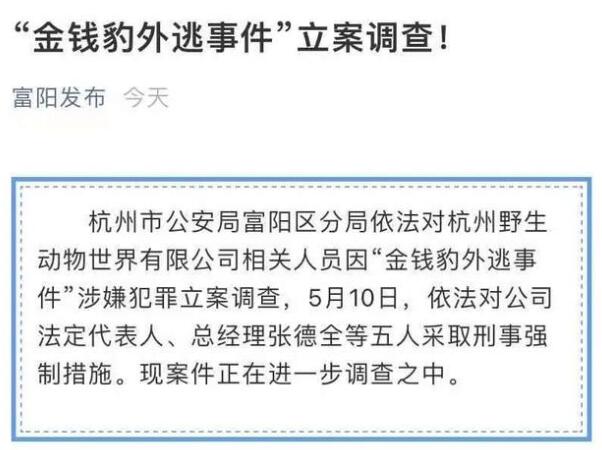 杭州市公安局富阳区分局依法对杭州野生动物世界有限公司相关人员因“金钱豹外逃事件”涉嫌犯罪立案调查,5月10日,依法对公司法定代表人、总经理张德全等五人采取刑事强制措施。