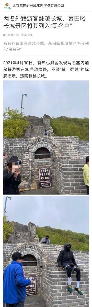 据@北京慕田峪长城旅游服务有限公司,4月30日,两名塞内加尔籍游客在20号敌楼处,不顾“禁止翻越”的标牌提示,违禁翻越长城。二人行为恶劣,造成不良影响,景区利用票务系统及监控系统定位两位游客信息,并将其列入“黑名单”,限制购票参观资格。