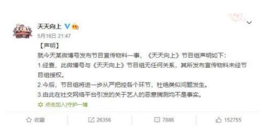 就今天某微博号发布节目宣传物料一事,《天天向上》节目组声明如下: