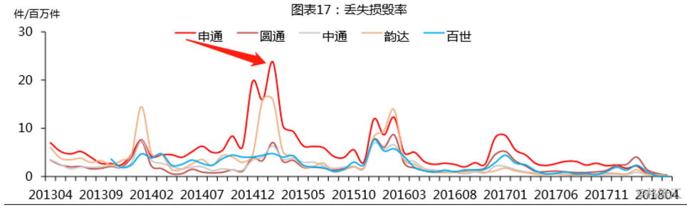 之所以会造成如此局面,服务水平不佳或成原因之一。相关研究报告显示,2015年-2017年,申通快递的投诉率综合来看明显高于同行,服务质量提升滞后,尤其是在每年的第四季快递企业旺季,更为显著。