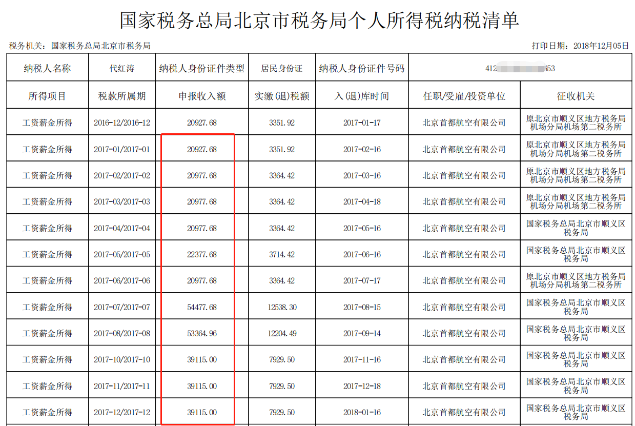 但是赵女士提供了一份显示打印时间是2018年12月05日的“国家税务总局北京市税务局个人所得税纳税清单”中显示,2017年史禹铭的申报收入为36万左右。