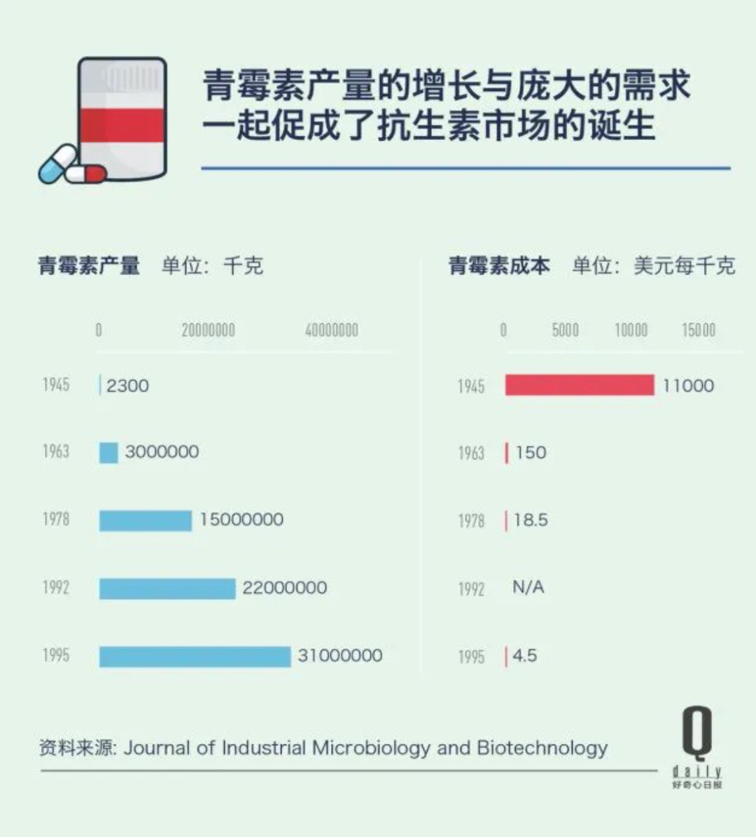 而再到后来,随着工业制备技术越来越成熟,产量越来越大,青霉素的价格也一路跳水,到现在,一针青霉素只有几毛钱,价格低到厂家不愿意生产。