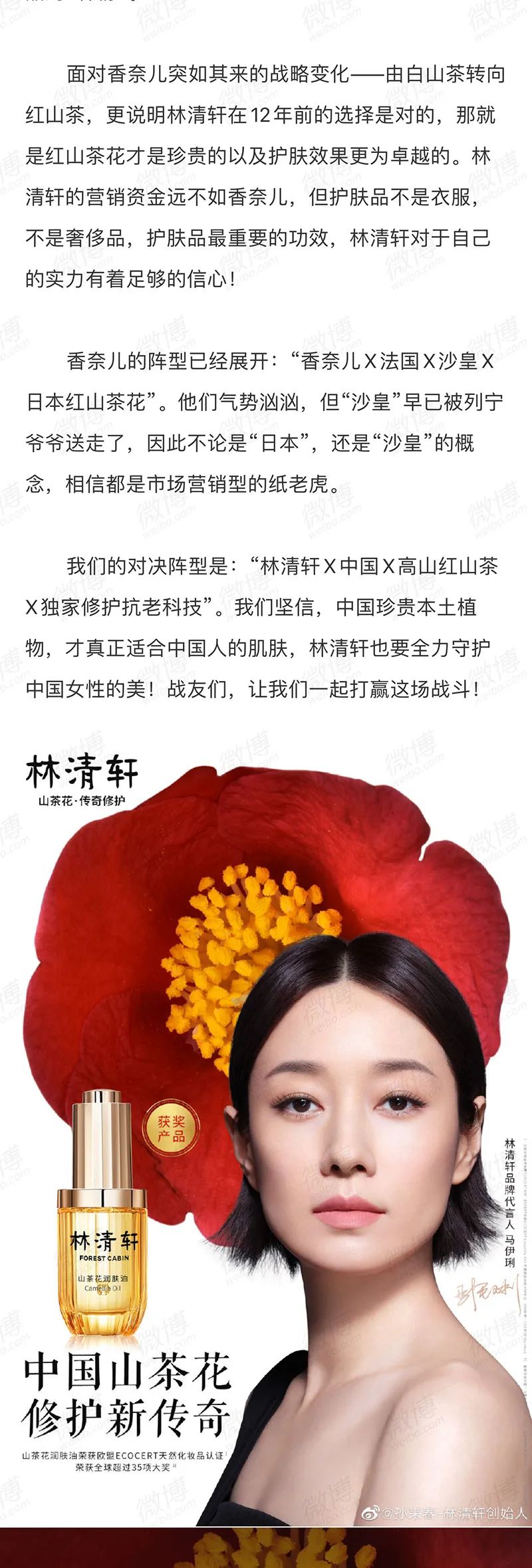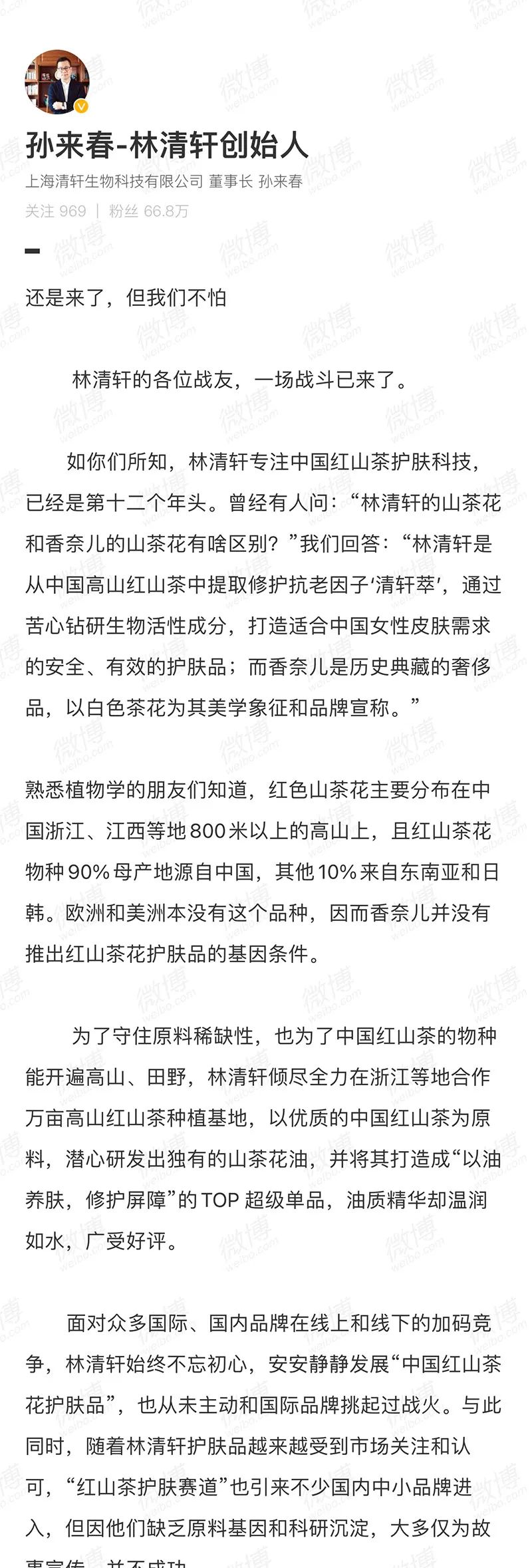 1月5日,关于“林清轩创始人指责香奈儿不正当竞争”相关话题登上微博热搜。孙来春近日在微博发文称,“林清轩的各位战友,一场战斗已来了”。此后他又转发介绍林清轩招牌产品山茶花润肤油的微博并表示,这是林清轩创业以来,受到最猛烈的进攻,这场保卫战,事关林清轩生死,也事关中国第一个高端化妆品品牌能否脱颖而出。
