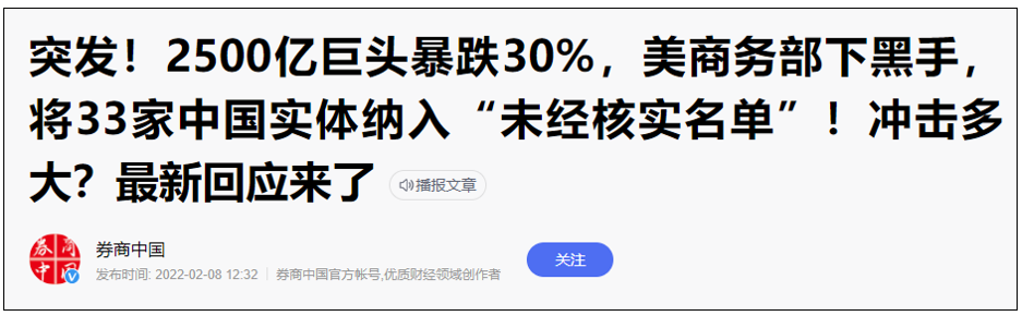今天中国股市出现大幅度的震荡,可能来源于一则信息:美商务部将33家中国实体纳入“未经核实名单”。