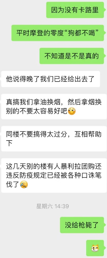 他们小区要求团购的团长需要在团购前出示营业执照,企业证明,通行证,司机卸货时48小时核酸证明,来路不明的团购不能进小区,也一直保持物价正常,基本米面肉菜调味的都有平价的团购,保供类团购物价一直正常吧,可能有加价但是不高,主要是加给运力了。片警也在居民群里,有人自己拉过零食饮料之类小团购,价格黑,被抓出来报给警官了,免费物资发了三波了,每波都是按一个门牌发一份。