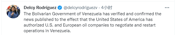 委内瑞拉副总统Delcy Rodriguez在推特上证实,美国政府授权美国和欧洲的石油公司在委内瑞拉谈判并重启运营。