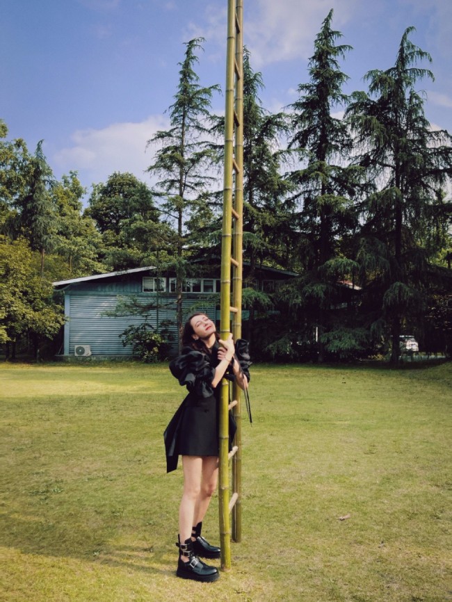 陈都灵一袭绿色抹胸长裙 站在柳树下宛若自然精灵