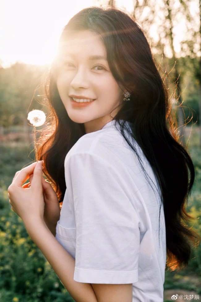 沈梦辰晒生日写真 穿白T手拿蒲公英素雅纯真