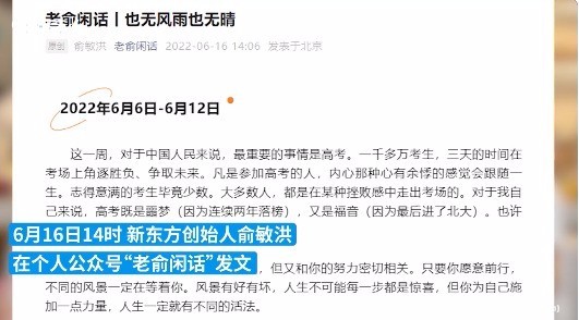 【大佬清醒!俞敏洪回应直播走红:可能一时热闹】6月16日,俞敏洪发长文回顾东方甄选发展过程,对于一周内的走红,他表示希望大家能够带有一种“一蓑烟雨任平生”的潇洒,保持一份“也无风雨也无晴”的沉着。