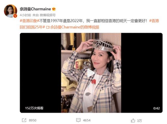 6月30日,佘诗曼发布戴港姐季军桂冠的视频,用她独有的方式庆祝香港回归25周年,并在文案中表示一直都相信香港的明天一定会更好!