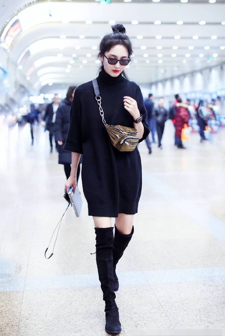 比如说戴着黑色墨镜、穿着黑色针织连衣裙、脚踩黑色长筒靴、背着一个褐色挎包,将自己的长发盘成一个丸子头,将自身的优势发挥地淋漓尽致。
