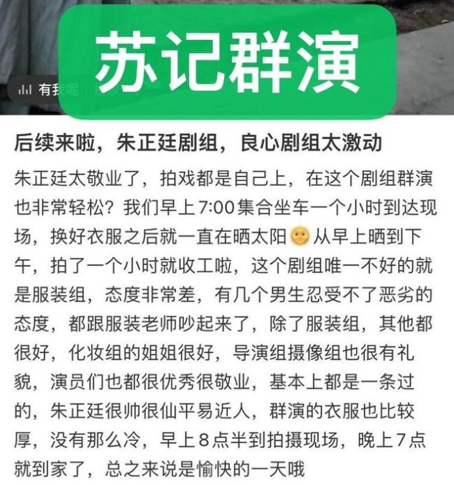 《苏记》剧组的化妆师和群演也都曾夸过朱正廷,称他人长得好看,性格也好,夸朱正廷在剧组很平易近人。