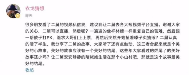 对于有网友建议让二舅去各大短视频平台直播。衣戈猜想回应:美好的故事应该有一个美好的结尾,这些年大家看过的烂尾了的美好故事还少吗?让二舅安安静静的陪姥姥生活在那个小山村吧,那就是这个故事最美好的结尾。