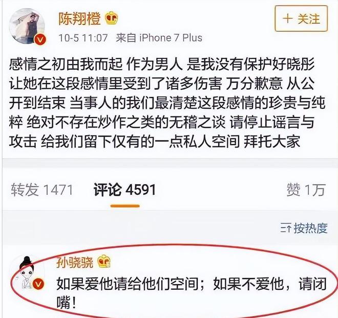 2017年,网上突然传来了陈翔和毛晓彤和平分手的消息;原本两人分手不会激起太大波澜,谁曾想,孙骁骁竟然在陈翔的博文下面横插一杠: