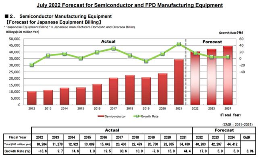根据日本半导体设备协会(SEAJ)公布的数据,他们预计2022年(2022年4月-2023年3月)日本半导体设备公司的销售额合计能够突破4万亿日元(4.0283万亿日元,不知道为啥一个预测值能精确到这个程度,可能是工匠精神吧),按照当前汇率(1日元=0.051人民币)换算成人民币的话大约2054亿人民币。