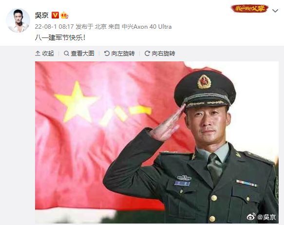 8月1日建军节,吴京、张凯丽在社交平台上晒出旧照致敬军人,庆祝建军95周年。