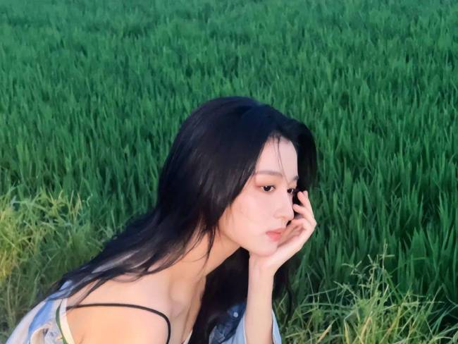 陈都灵一袭绿色抹胸长裙 站在柳树下宛若自然精灵