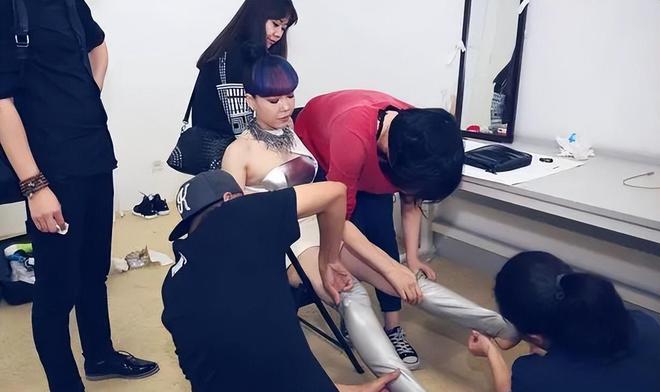 起因是她马上要上台,坐在凳子上被三个工作人员伺候穿袜子。