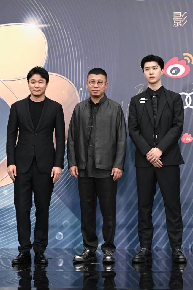 《了不起的夜晚》剧组集体亮相红毯。左起:易小星(监制)、马凯(导演)、范丞丞、王子璇