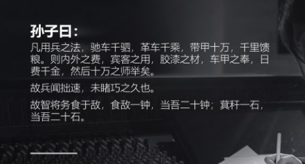 孙子说,要动员作战,出动一千辆战车,一千辆运输的辎重车,统兵十万,要从后方运粮食到边境到战场,大概要运一千里的距离。动十万军队,有内外日常的开支,有使者往来的费用,有修缮武器用的胶水油漆,战车所需要的润滑膏油,修理盔甲所需要的金属和皮革,每日要耗费千金。做好这些准备之后,十万大军才能出动。