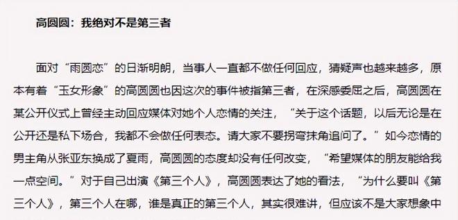卓伟开发布会时爆料过,其实当时夏雨和袁泉是分手状态,高圆圆并没有插足。但夏雨为了维持和袁泉的模范情侣形象,不愿意公开承认分手,也不肯站出来替高圆圆澄清。