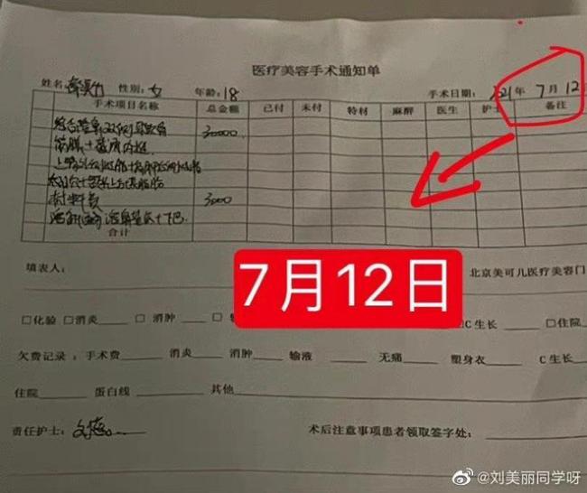 据网友爆料称,都美竹当时收到了50万元的转账之后,不到一周时间便消费了8万元,其中3万拿去整容。从刘美丽晒出的手术通知单中可以看到,2021年7月12日都美竹登记了手术,随后7月16日就在社交平台发文谎称自己一直在接受电击治疗。