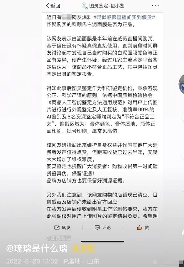 相关报道:网友曝鉴定机构确定戚薇直播间卖假货现店铺已清空