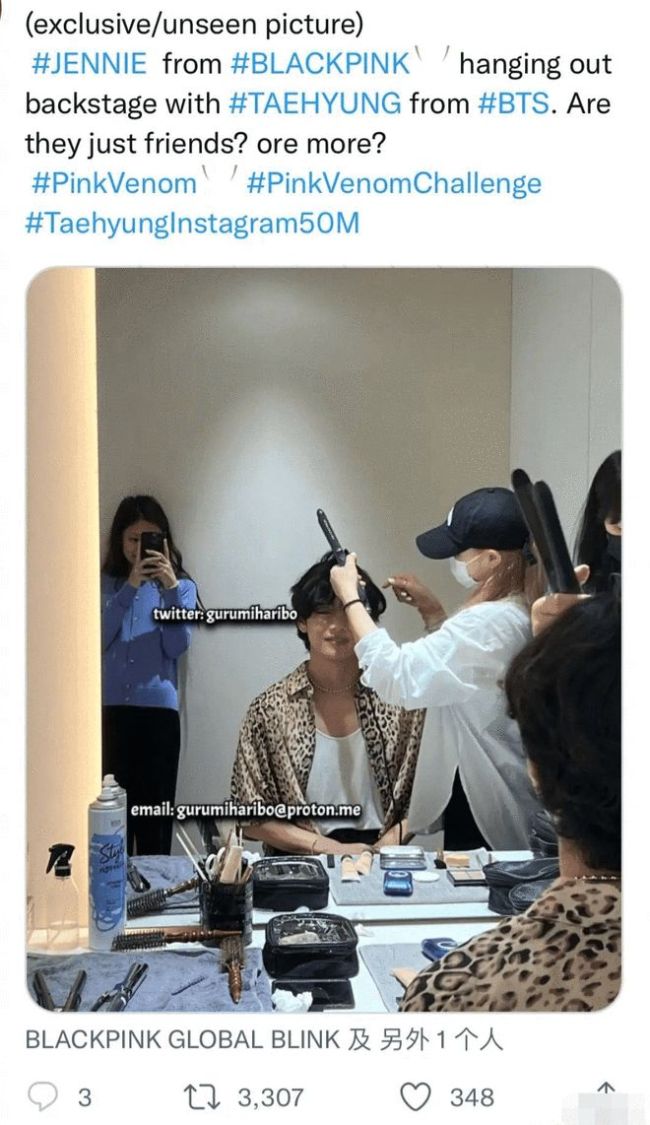 此前,Jennie与金泰亨就曾传过恋爱绯闻。据韩媒报道,有网友称拍到了TOP级爱豆在济州岛约会的照片,而后网民们从公开的照片中推测这两名TOP爱豆分别是防弹少年团成员金泰亨和女团BLACKPINK成员Jennie。该照片引发关注后不久,作者就删除了相关内容。有人就此事向作者询问“删除照片的理由”,作者回应称“没有说拍到的照片就是Jennie和金泰亨的,因为看起来好像会成为问题,所以删除了。”
