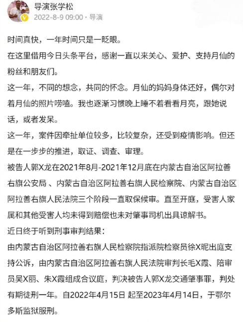 然后也就车祸案情况给出了一个回应,表示案件虽然牵扯复杂,但经过层层剖析,最终于2022年4月15日,经过法院裁定,郭X龙这才因交通肇事罪被判入狱一年,于鄂尔多斯监狱服刑。