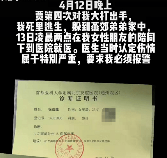 最近的一次则是在4月12日,因为跑到弟弟家躲起来,这才捡回一条命,但从她晒出的13日去医院做的伤情鉴定能发现,足以达到立案标准。