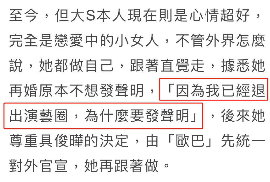导读:大S无惧二婚老公争议,霸气官宣退圈,称再婚事宜已告知两个孩子