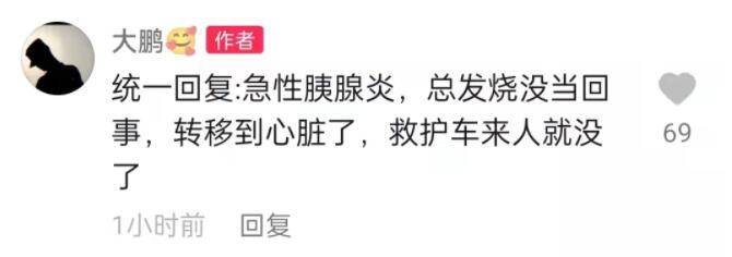 至于“唐痘痘”突然去世的原因,“大鹏”也在评论区透露,表示是因为骤发急性胰腺炎导致。